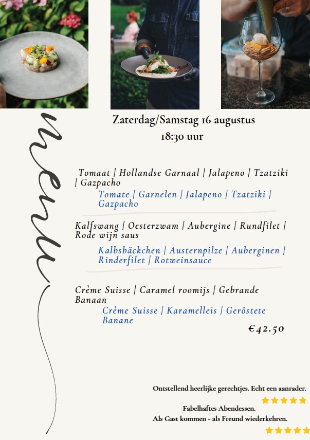 In den Monaten Juli und August bieten wir am Samstagabend ein leckeres Drei-Gänge-Menü aus eigener Küche. Lassen Sie sich von den Aromen Zeelands überraschen. Die Speisekarte basiert auf lokalen saisonalen Produkten und wechselt (fast) jede Woche.